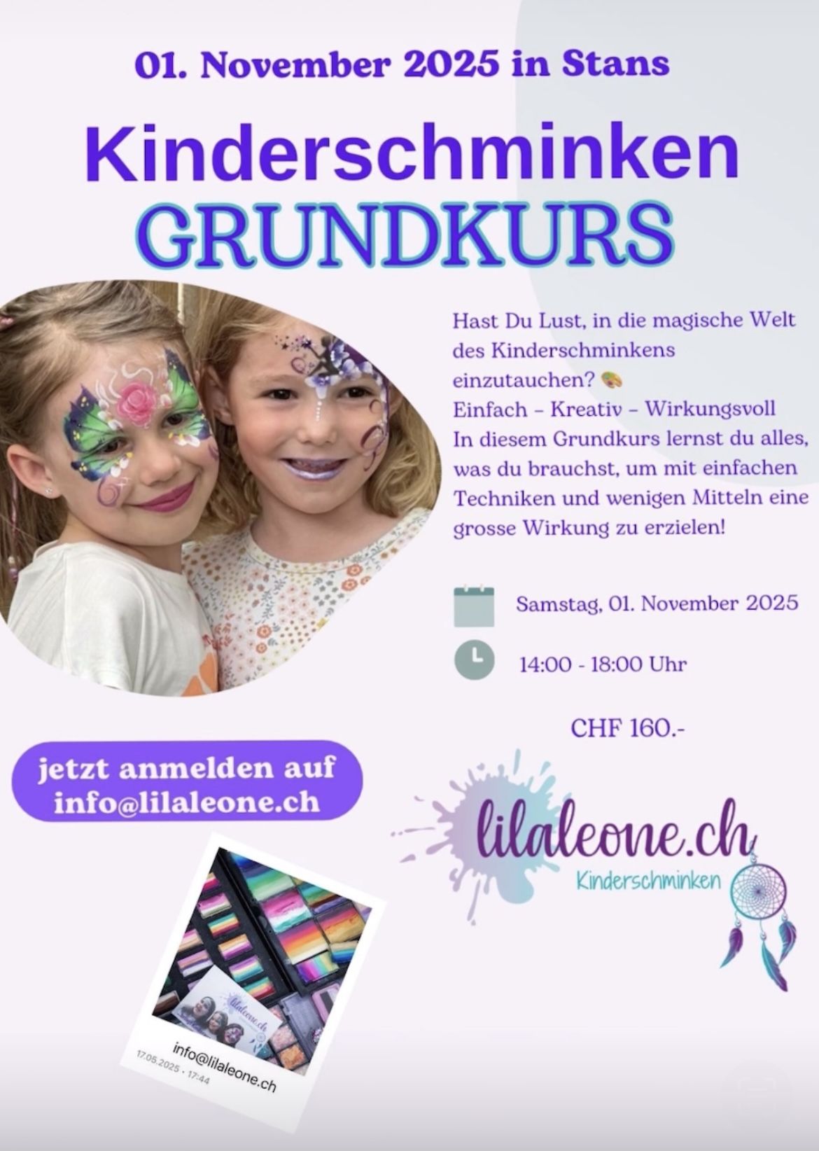 In der Zentralschweiz (Nidwalden, Luzern, Obwalden, Zug, Zürich, Schwyz und Uri ) aber auch in der gesamten Schweiz bin ich mit meinen Schminkutensilien unterwegs, um kleine Gäste zu verzaubern und besondere Momente zu schaffen. Ob beim grossen Firmenfest, einem Tag der offenen Tür, einem Sportevent oder privaten Geburtstag. Jeder Event wird durch meine Arbeit bunt und fröhlich.